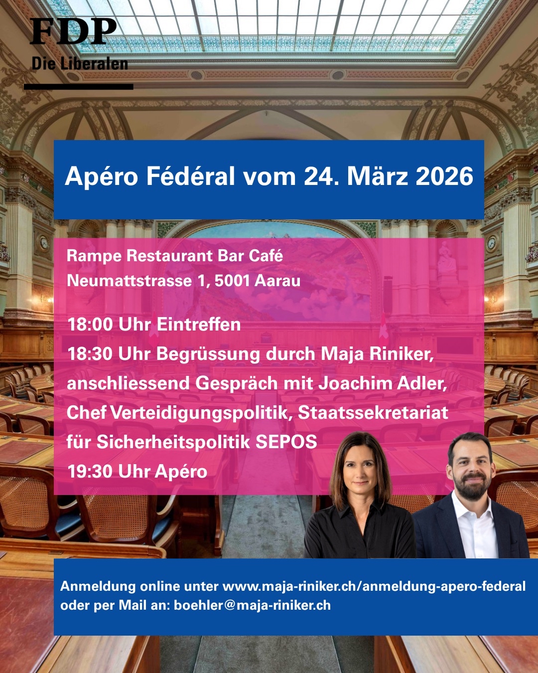 Der „Apéro Fédéral“ von Nationalrätin Maja Riniker ist am 24.03.2026 zu Gast in der Rampe. Mit dabei ist Joachim Adler, Chef Verteidigungspolitik, Staatssekretariat für Sicherheitspolitik (SEPOS) als Gesprächspartner vom Abend. Anschliessend bietet ein Apéro Raum für Austausch und persönliche Gespräche.