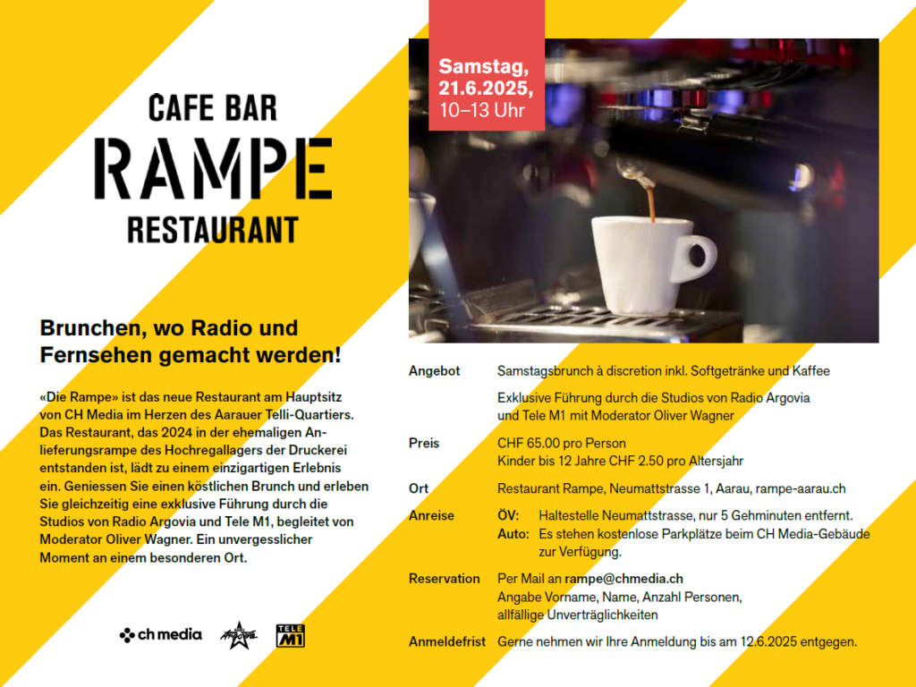 «Die Rampe» ist das neue Restaurant am Hauptsitz von CH Media im Herzen des Aarauer Telli-Quariters. Das Restaurant, das 2024 in der ehemaligen Anlieferungsrampe des Hochregallagers der Druckerei entstanden ist, lädt zu einem einzigartigen Erlebnis ein. Geniessen Sie einen köstlichen Brunch und erleben Sie gleichzeitig eine exklusive Führung durch Studios von Radio Argovia und Tele M1, begleitet von Moderator Oliver Wagner. Ein unvergesslicher Moment an einem besonderen Ort.