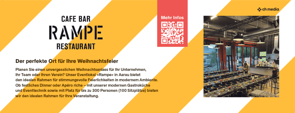 Ob gemütlich beim Apéro oder stilvoll beim Dinner – in der «Rampe» machen wir Ihre Feier zum Erlebnis. Wir sorgen dafür, dass Ihr Team oder Verein die Festtage genüsslich einläutet.